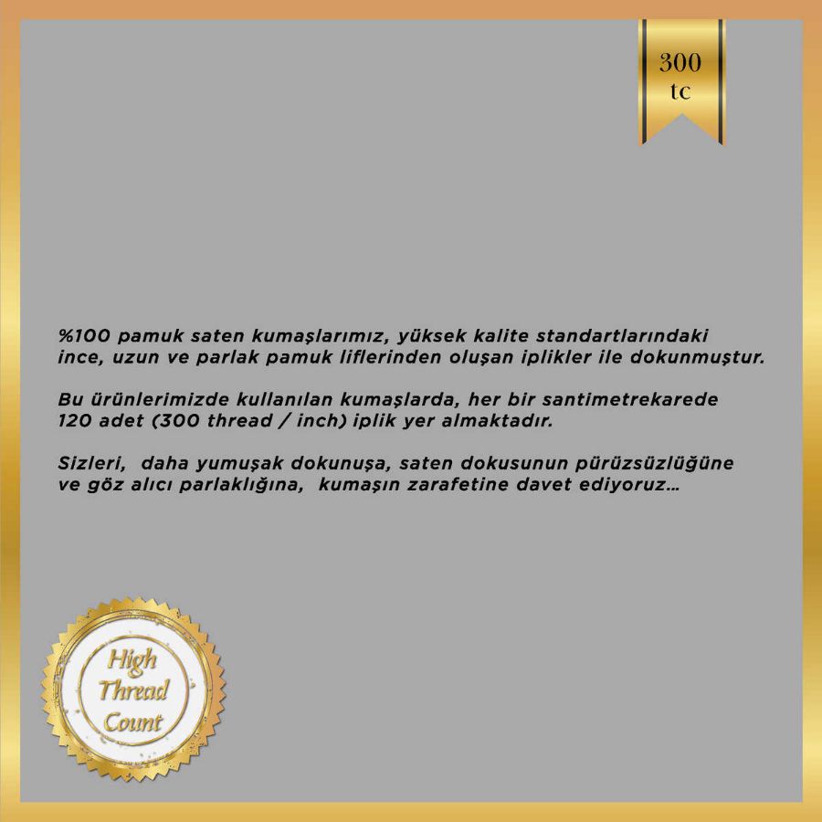 Kumaş Kalitesi;%100 Pamuk saten kumaşlarımız,yüksek kalite standartlarındaki ince,uzun ve parlak pamuk liflerinden oluşan iplikler ile dokunmuştur.Bu ürünlerimizde kullanılan kumaşlarda her bir cm² de 120 adet (300 thread/inch) iplik yer almaktadır.Sizleri,daha yumuşak dokunuşa,saten dokusunun pürüzsüzlüğüne ve göz alıcı parlaklığına,kumaşın zarafetine davet ediyoruz.